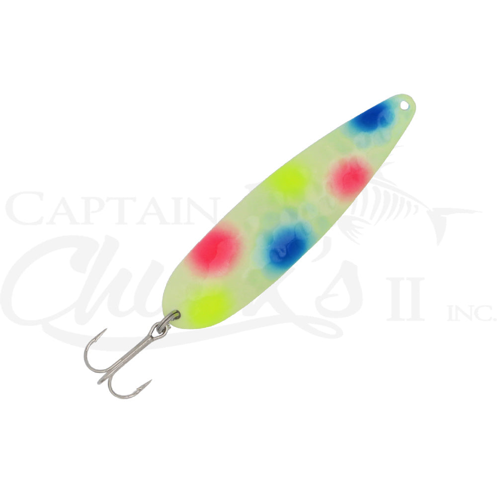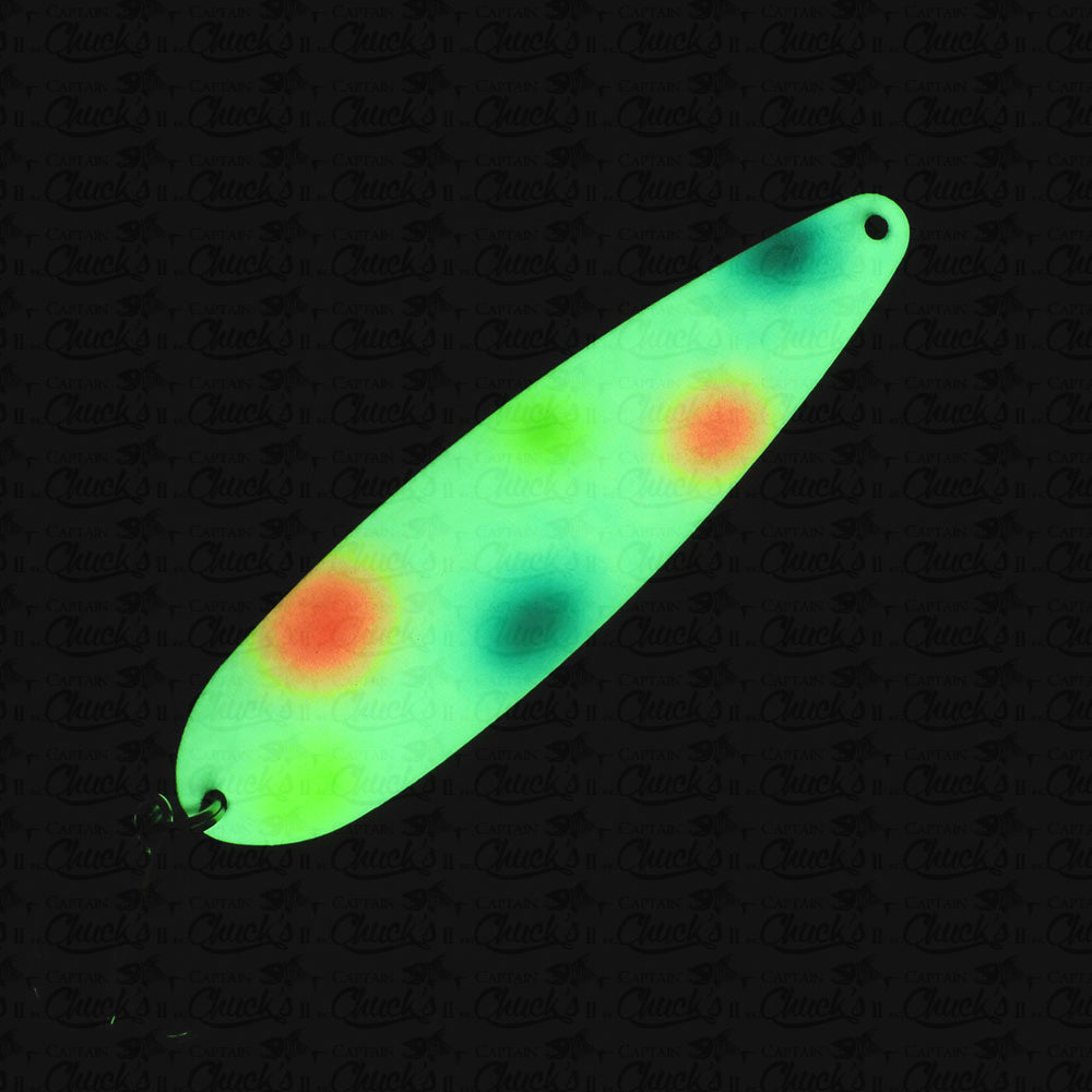 Moonshine Original Trolling Spoons are some of the brightest glowing lures that you'll find on the market today! Our goal is to produce high quality Super Glow tackle products. Each lure is hand painted and inspected to ensure a quality product. After being exposed to natural or UV light, these spoons will be glowing for hours on end. Moonshine Standard Trolling Spoons are also ideal for being fished with during the day as they are highly UV-reflective.