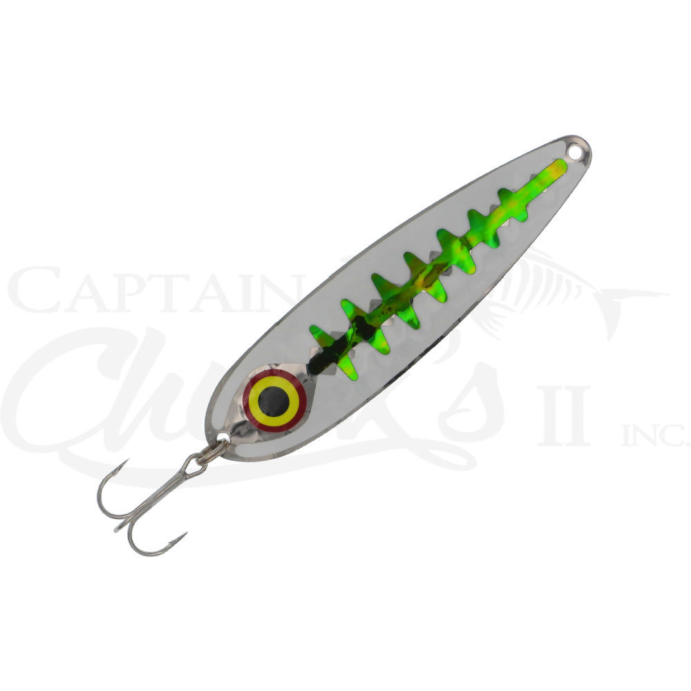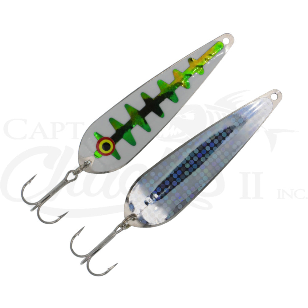 The cupped, taped design of the Pro King Spoon is perfect for catching salmon, trout and other game fish. They use #1 VMC® treble hooks and can be trolled at a variety of speeds for different results. The silver holographic back is taped with the best color combinations, covering the full color spectrum. They are 4-3/4" long.