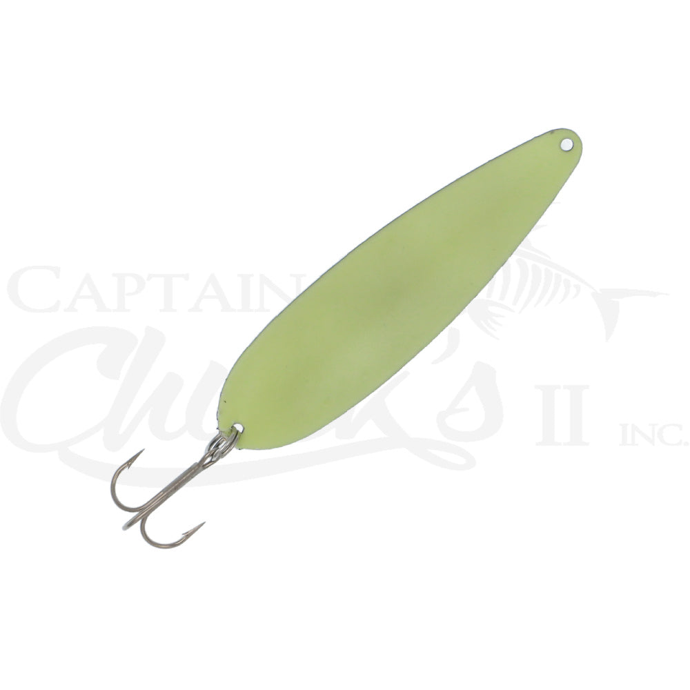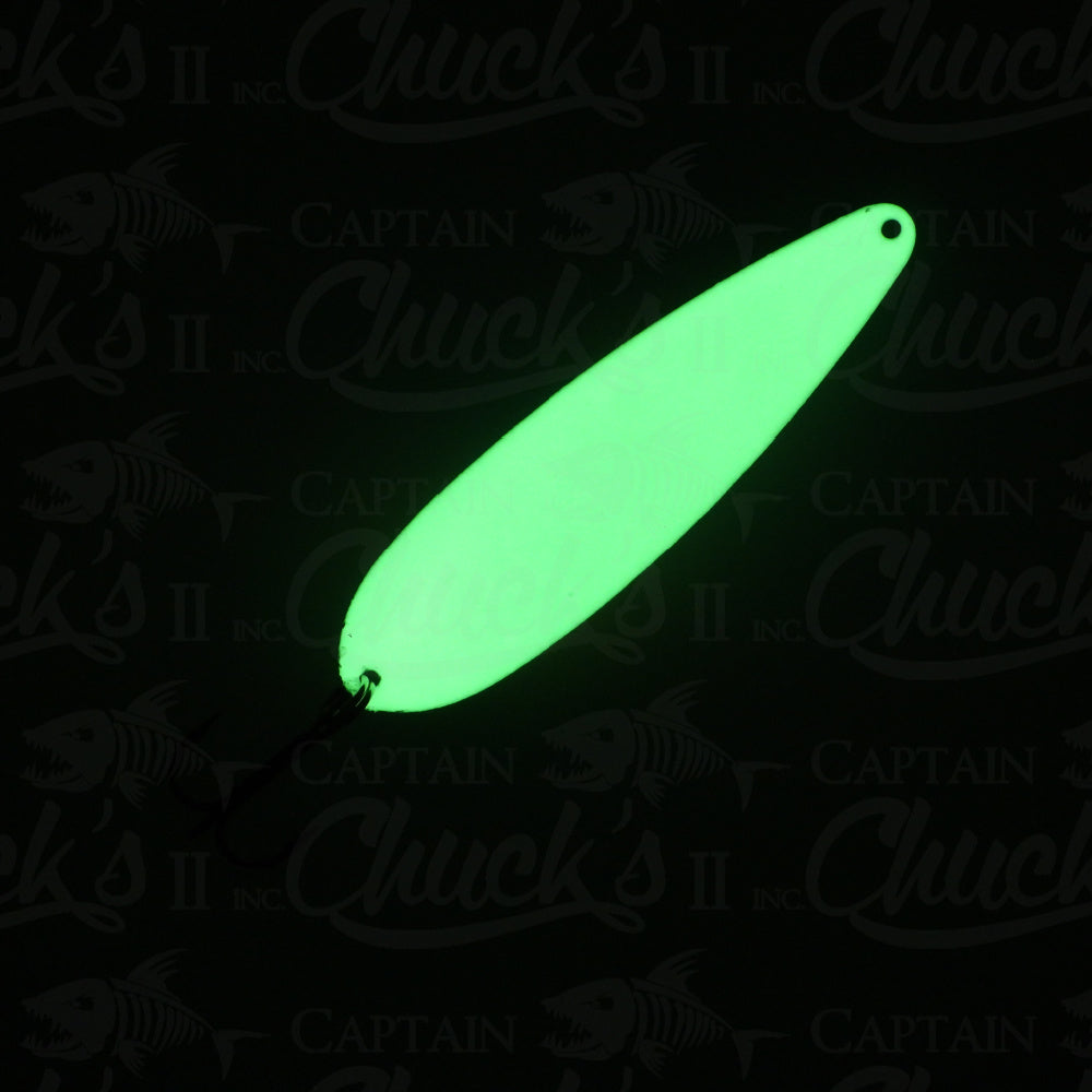 A Captain Chuck's Exclusive! Moonshine's RV Trolling Spoons are some of the brightest glowing lures that you'll find on the market today! These spoons have the same great features of the original but have an RV tape for a fish attracting, unique look. Moonshine is known for producing high quality Super Glow tackle products. Each lure is hand painted, taped and inspected to ensure a quality product. After being exposed to natural or UV light, these spoons will be glowing for hours on end. Moonshine RV Trolling Spoons are also ideal for being fished with during the day as they are highly UV-reflective.