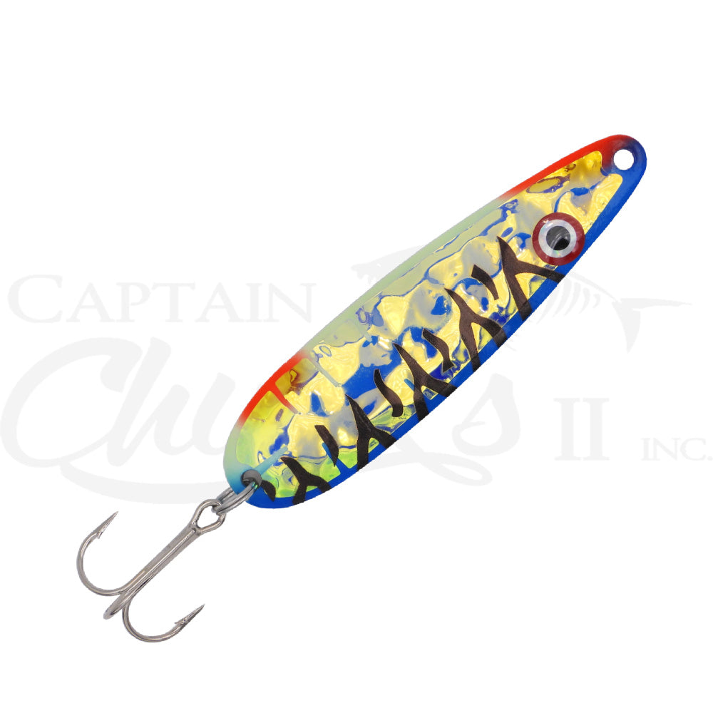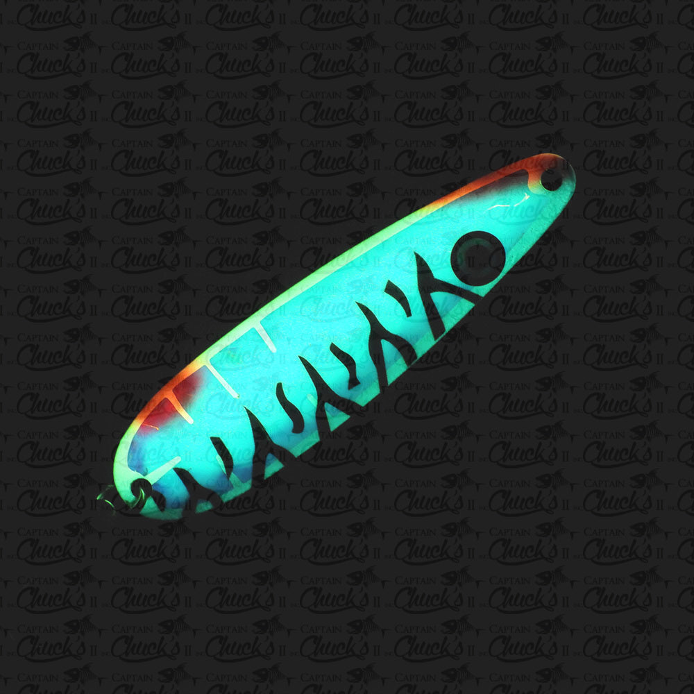 Moonshine's RV Trolling Spoons are some of the brightest glowing lures that you'll find on the market today! These spoons have the same great features of the original but have an RV tape for a fish attracting, unique look. Moonshine is known for producing high quality Super Glow tackle products. Each lure is hand painted, taped and inspected to ensure a quality product. After being exposed to natural or UV light, these spoons will be glowing for hours on end. Moonshine RV Trolling Spoons are also ideal for being fished with during the day as they are highly UV-reflective.