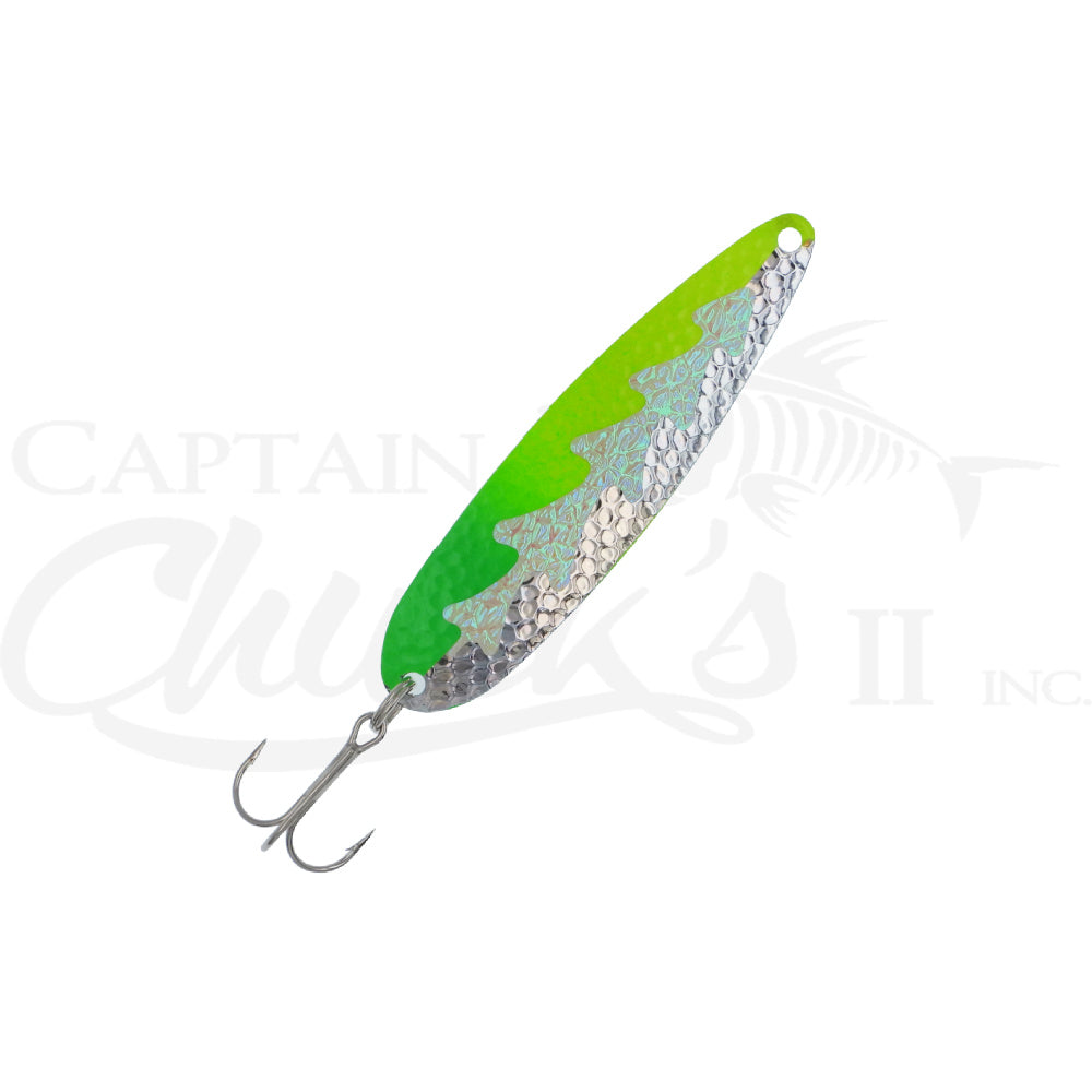 Michigan Stinger Stingray Spoons are a light weight trolling spoon made with top quality materials. Stingray's are slightly larger than stingers to better attract fish when the bait gets bigger! Most colors offer three different blank options, Copper, Nickel, or Gold. These spoons feature a thin, slightly curved design to give them a fish attracting flutter action. Offered in many different colors to attract even the most weary of fish, Michigan Stinger spoons are a must for every tackle box. Stinger Standard Spoons were originally designed for Walleye, but they have gained tremendous popularity with the Trout and Salmon anglers. These spoons are proven effective in the spring for Browns and Coho off planer boards, as a slider off downriggers, or any time small baitfish are encountered. These spoons are great for freshwater trolling applications.Some of the colors are offered with a new UV tape to add an extra reflective simmer even in deep water applications.