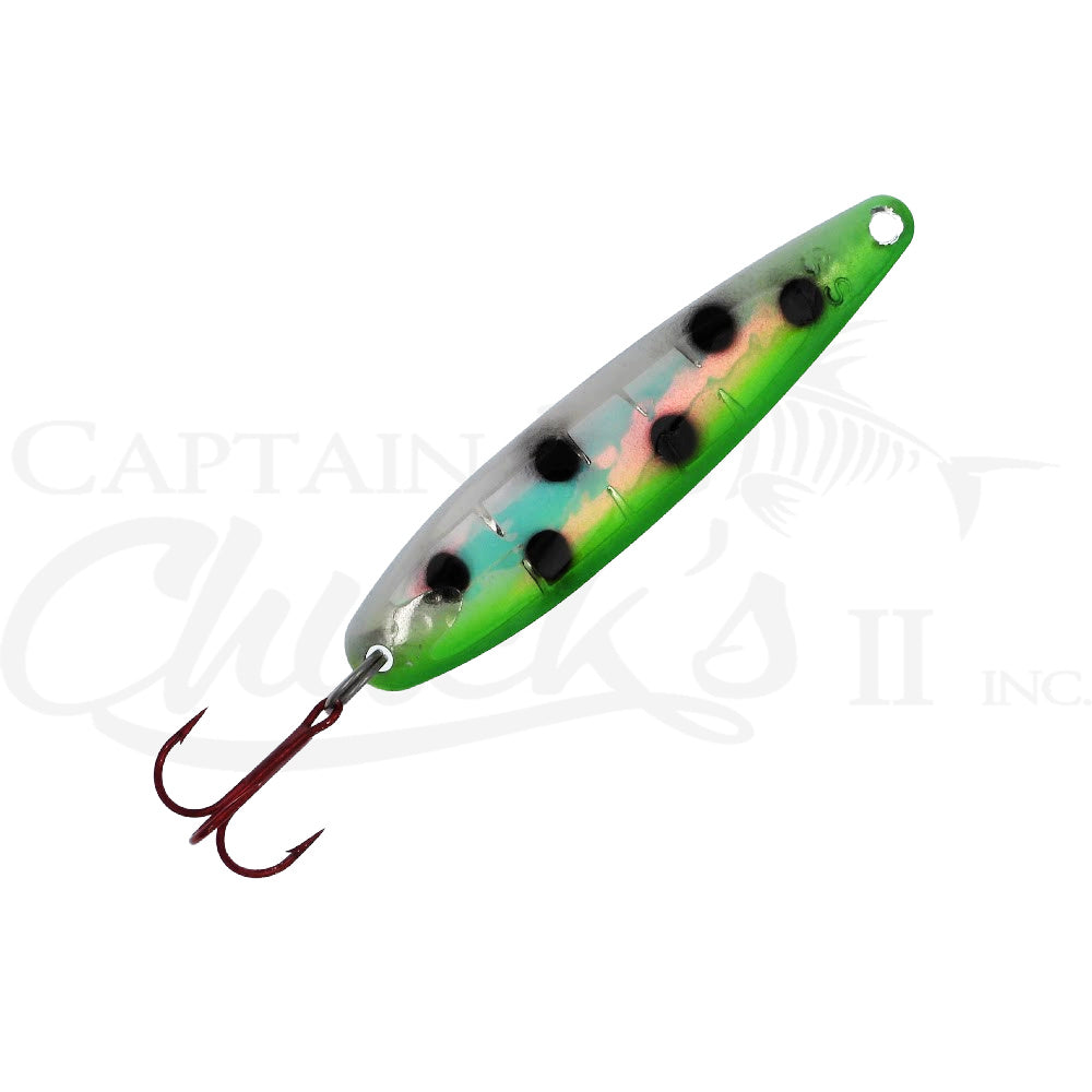 Dreamweaver's Super Slim Series Spoons measure 3 5/8" long and are designed to catch Steelhead, Coho, Lake Trout, or King Salmon. They are a lighter weight, unique shaped spoon that you can fish anywhere in your trolling spread.