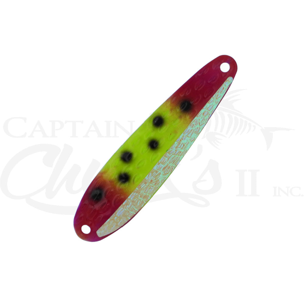 Introducing the Yeck Lures Y66 standard size Trolling spoon. These are a lighter weight spoon on a 4", half ripple blank that troll well at any speed. They feature a variety of fish catching and glow colors. They are equipped with premium split rings and hooks.