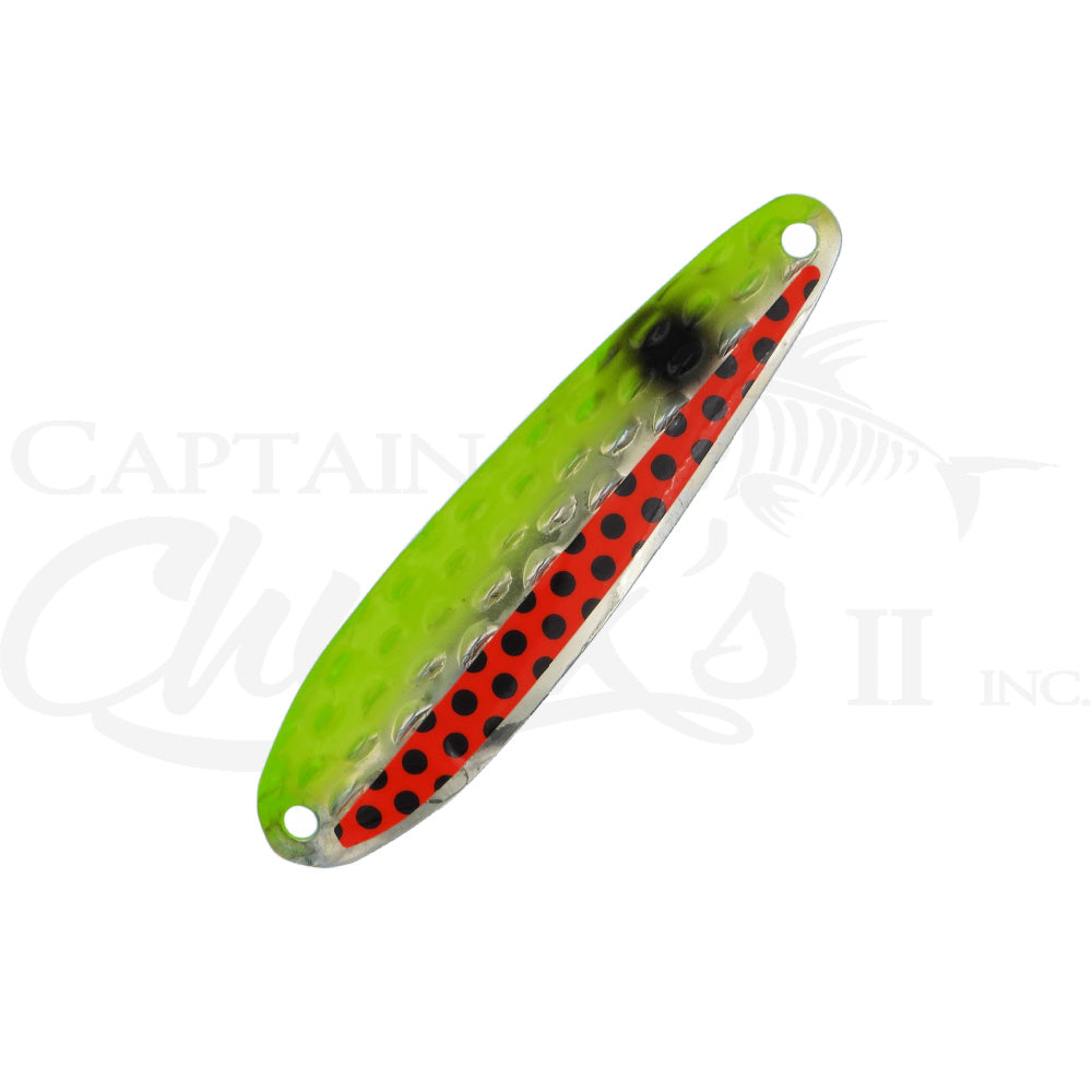 Introducing the Yeck Lures Y66 standard size Trolling spoon. These are a lighter weight spoon on a 4", half ripple blank that troll well at any speed. They feature a variety of fish catching and glow colors. They are equipped with premium split rings and hooks.