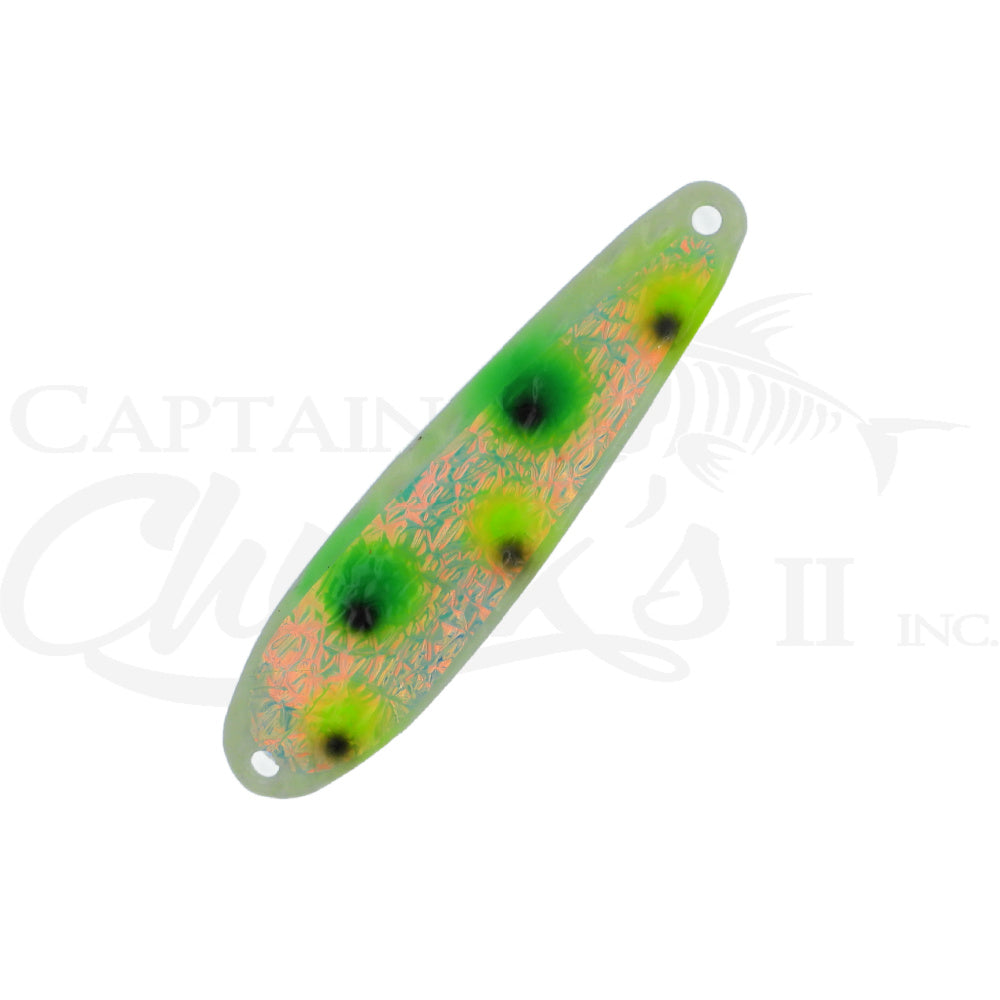 Introducing the Yeck Lures YG66 Standard size Trolling spoon. These are a lighter weight spoon on a 4" ripple blank that troll well at any speed. They feature a variety of fish catching glow colors and come with premium split rings and hooks.