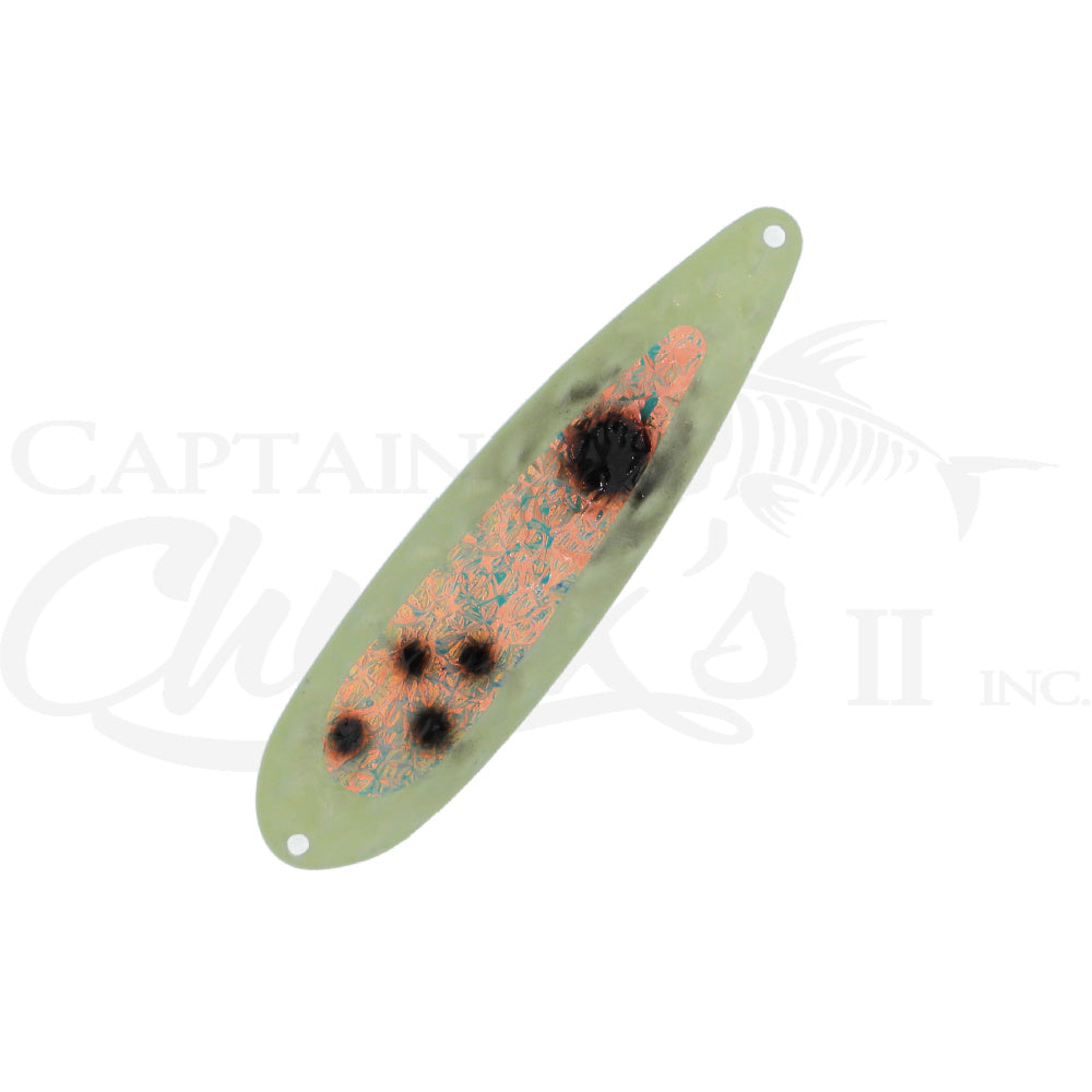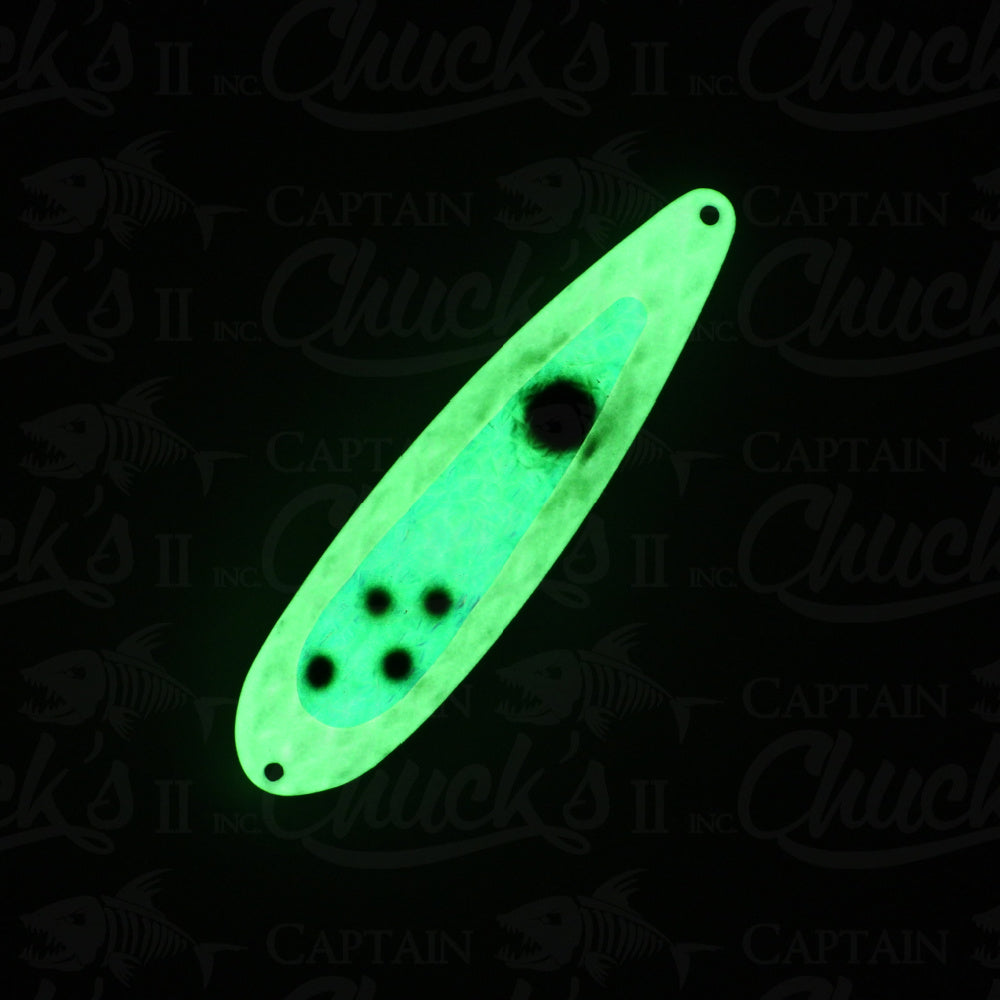 Introducing the Yeck Lures YG77 Magnum Trolling spoon. These are a lighter weight spoon on a 5" ripple blank that troll well at any speed. They feature a variety of fish catching glow colors and come with premium split rings and hooks.